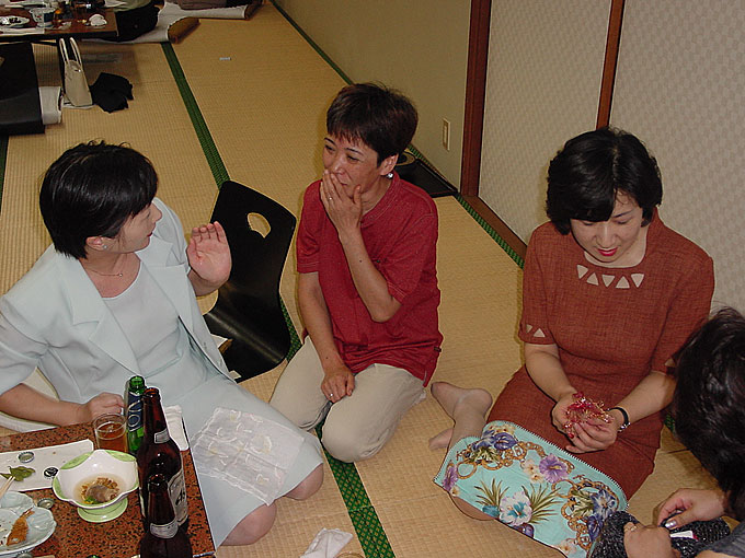 旧姓登坂久子さんに話しかける旧姓小野美晴さんは、歯を気にしているようです。右手は旧姓小野方子さん。