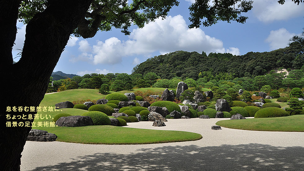 島根県安来には、足立美術館がある。展示されている日本画や陶器などすばらしいものがたくさんあるのだが、ここの見ものは、息を呑むほどに美しい日本庭園だ。