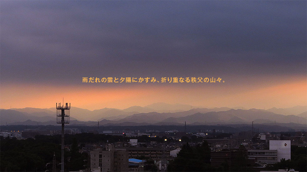 The mountains of Chichibu such as the black-and-white drawing appeared in the west sky which added to some brightness at dusk of the rainy season. I show fantastic scenery whether a raindrop mixed in air creates gradation luckily. Based on such a scenery, I acquired an emotional color to be a little more like that artificially. There is the part which I put out elsewhere.