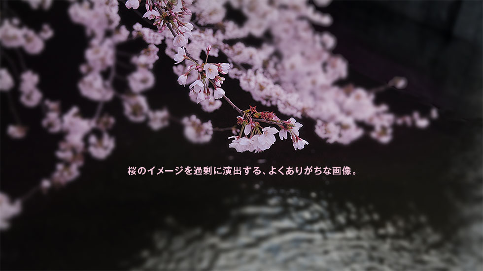 When it is spring in Japan of the cherry tree enthusiast, images of the cherry tree are broadcasted well. However, the most are created excessively and are an image changed until color taste. Most of the colors of the petal of the Yoshino cherry tree are white, but originally think that most of Japanese are cerise. The picture coming out to the world changes an image unnaturally to match it with the image. As for the audience, so-called fake news is shown. With Tokyo, the picture of the cherry tree of the Kanda River, I reproduced a way of direction.